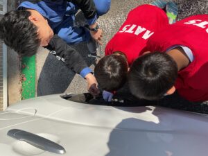 11月20日、はなの木幼稚園及び豊田花園幼稚園と名鉄自動車専門学校自動車整備科の合同イベント「ちびっこ整備士体験」を、それぞれの園にて実施いたしました。自働車専門学校からは、整備体験が可能な自動車とともに、整備士資格を持つ職員らが幼稚園を訪問。園児たちには、真っ赤なツナギを用意して「ちびっこ整備士」として実際にタイヤ交換のネジを絞めたり、エンジンルームの中を点検してもらいました。園児たちは、とても真剣な眼差しで取り組みながらも「ツナギが可愛い!」「うまくできた!」など、笑顔が溢れるなか体験を実施することができました。