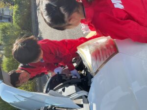 園児たちには、真っ赤なツナギを用意して「ちびっこ整備士」として実際にタイヤ交換のネジを絞めたり、エンジンルームの中を点検してもらいました。
